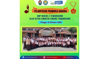 Pelantikan Pramuka Garuda oleh Ketua Kwarcab Temanggung pada hari Mimggu, 16 Oktober 2022 dilaksanakan di kantor Kwarcab Temanggung. Sebanyak 49 Pramuka Garuda Tingkatan Penggalang dari pangkalan SMP Negeri 2 Temanggung secara resmi dilantik dan disahkan oleh ketua Kwarcab Temanggung Bapak...